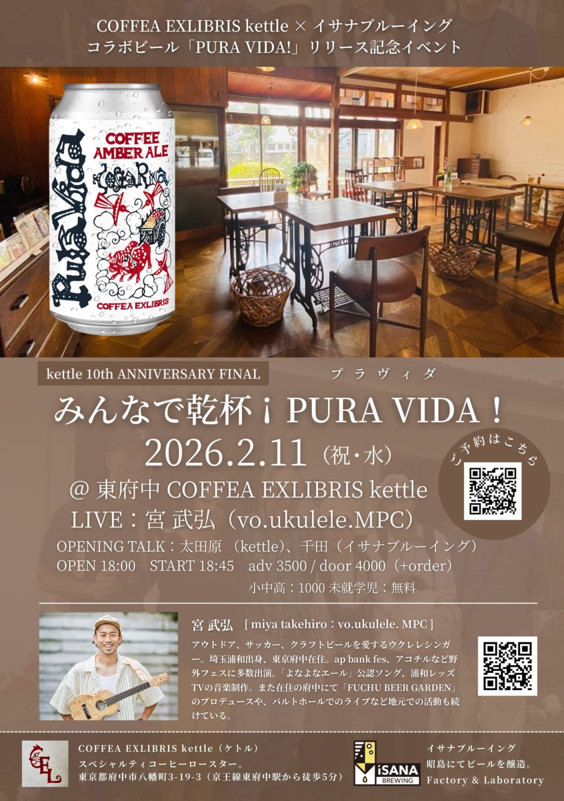 今回はケトルと昭島のブルワリー「イサナブルーイング」のコラボビール「PURA VIDA!」のリリースのお祝いも兼ねて、トーク&ライブの構成でお送りします!