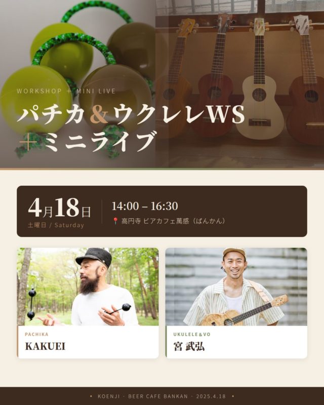 KAKUEI(パチカ)と宮 武弘(ウクレレ)でワークショップとミニライブを開催します。